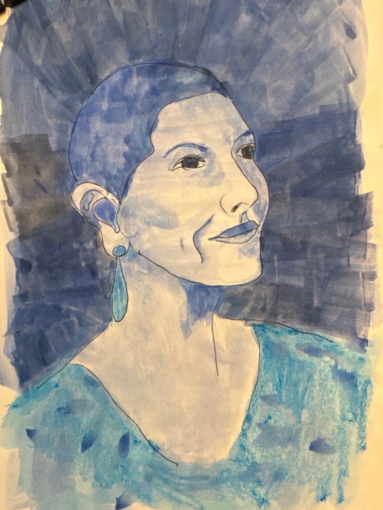 I am trying monochrome I blue today. I used a couple of shade of blue – next time I will just use one and see how I do with values. This was watercolor, ink, and water base crayon.